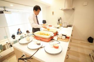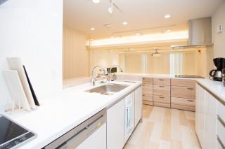 白を基調としたキッチンは一般家庭の倍の大きさの最新のシステムキッチンと料理家電、豊富な食器類を揃えたキッチンスペース。キッチンを使うお料理教室や製造販売業や飲食店オープンのための試作をする企業様にはピッタリです。また、隣接するリフェクトリールームと一緒に使う事で社内会議や他社を招いての交流会も自社オフィスに招き行う事が出来ます。出張シェフやケータリングを利用する事も出来ます。